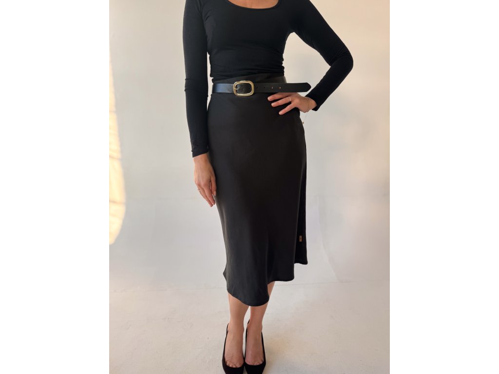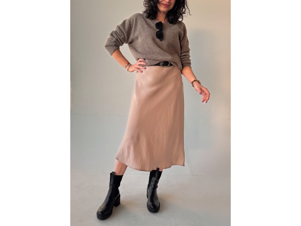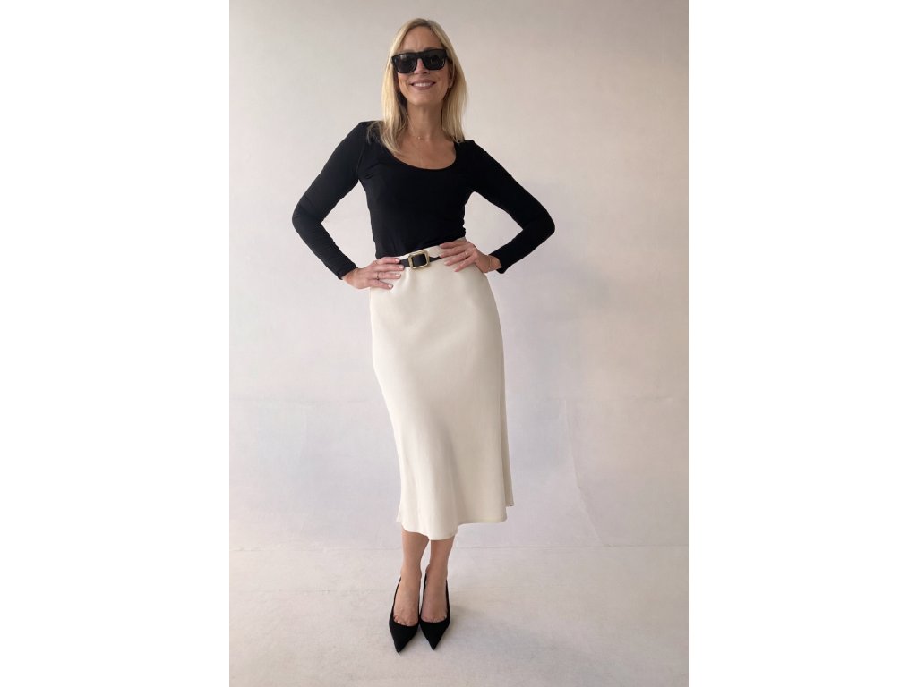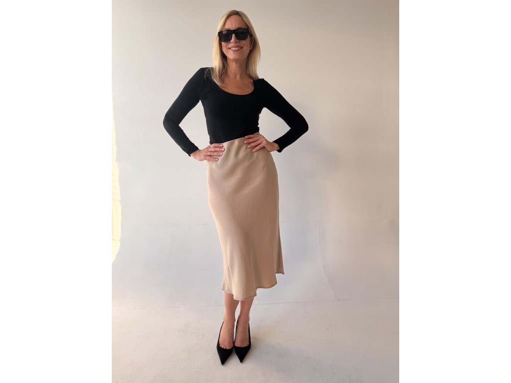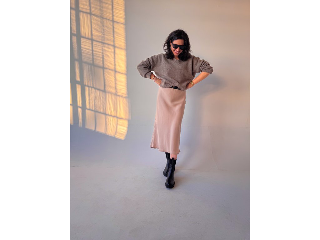 Materiál je hladký, jemný na dotek, přirozeně prodyšný a působí velmi elegantně. Sukně se skvěle kombinuje – můžete ji nosit s podpatky pro sofistikovaný vzhled, ale stejně dobře funguje i s teniskami pro ležérní, sportovnější outfit.